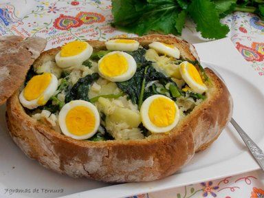 Comece por levar ao lume brando um tacho com azeite. Coloque aí as postas de baclhau, os alhos socados e o louro. Tape e deixe ficar lentamente, cerca de 20 minutos, ou até o bacalhau estar macio e bom para lascar. Descasque as batatas e corte-as em rodelas grossas. Leve-as a cozer em àgua fervente com sal. Coloque os ovos a cozer. Arranje os grelos e junte-os às batatas. Deixe cozinhar, mas sem deixar cozer demais. Lasque o bacalhau, retire o alho e o louro e no azeite coloque a cebola. Quando a cebola estiver meio cozida junte o bacalhau. Tempere de pimenta de moinho. Retire a tampa ao pão e escave o interior de forma a retirar o miolo. Junte as batatas e os grelos ao bacalhau e envolva ligeiramente. Descasque os ovos, Coloque a mistura na caixa de pão, por cima as rodelas de ovos e regue com o azeite do tacho, Tape e leve ao forno pré aquecido, cerca de 10 minutos. O azeite sobre a broa dá-lhe um sabor maravilhoso!