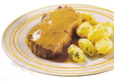 Tempere os nacos de carne com sumo de limão, os dentes de alho esmagados, sal e pimenta. Deixe marinar por 20 minutos, virando-os de vez em quando. Entretanto, descasque as batatas, lave-as e coza-as em água com sal, por cerca de 15 minutos. Frite a carne na manteiga (reserve uma colher das de sopa de manteiga) e no azeite. Depois de fritos, coloque os nacos de vitela na travessa. Adicione à gordura da fritura a farinha desfeita num pouco de caldo de carne; rectifique os temperos e leve de novo ao lume para engrossar. Regue os nacos com este molho. Salteie as batatas na restante manteiga e sirva-as com a carne, polvilhadas com salsa picada.