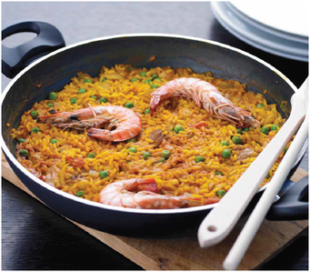 Num recipiente coloque o sal, a pimenta e o pimentão. Unte bem as carnes com a mistura anterior. Aqueça o óleo numa frigideira larga. Adicione o frango e o porco e salteie durante 10 minutos. Retire as carnes e reserve. Junte ao preparado da frigideira as cebolas, o alho e o açafrão. Adicione o tomate e cozinhe durante 5 minutos ou até engrossar. Devolva as carnes à frigideira. Junte o arroz e uma boa parte do caldo de galinha quente. Reserve o restante caldo. Cozinhe até levantar fervura. Reduza para lume brando durante 15 minutos sem tampa. Rectifique os temperos. Adicione as ervilhas, os camarões e o restante caldo. Cozinhe até o arroz estar cozido. Sirva na frigideira.