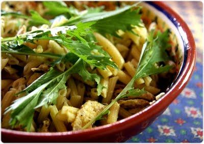 Quando o tempo está quente, uma salada de massa é sempre apreciada cá em casa para uma refeição fresca e ligeira mas todavia nutritiva. O tradicional manjericão do molho pesto é aqui substituído por estragão, uma erva com um sabor refrescante e delicado que combina muito bem com carne de frango.